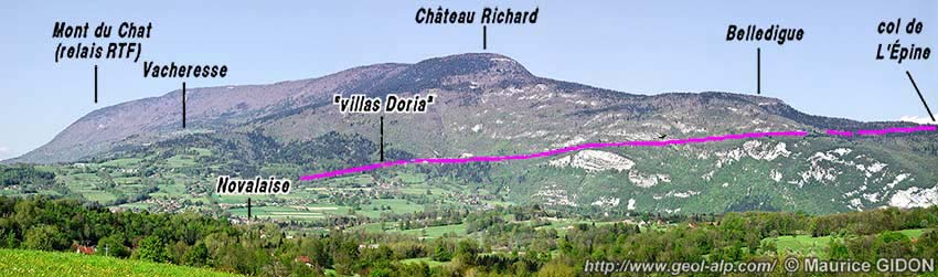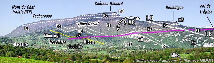 ![]() Le versant occidental du Mont du Chat, vu du sud-ouest, depuis le village d'Ayn (en pourpre le tracé de la D.916). f.B = faille subverticale, d'orientation nord-sud, de la bordure ouest du plateau de Belledigue NB : cette cassure abaisse la voûte de l'anticlinal du Mont du Chat (a.MC) du côté oriental, puis se perd, vers le nord, dans le revers oriental du Château Richard (sa géométrie suggère qu'elle puisse représenter une faille extensive antérieure au plissement). |