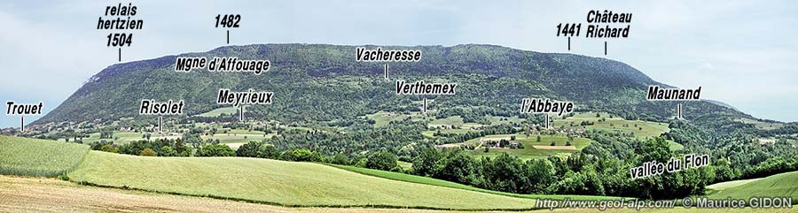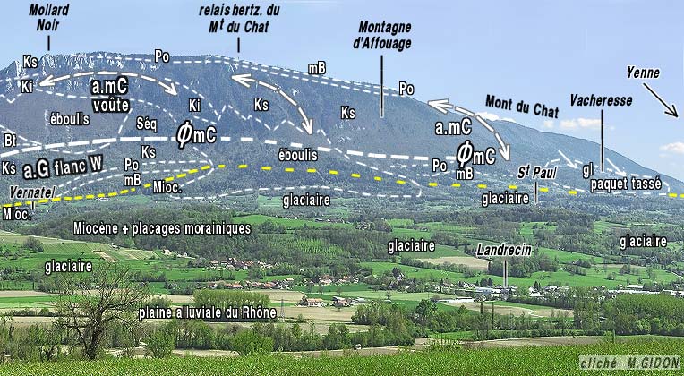 ![]() L'extrémité septentrionale du Mont du Chat, vue du nord-ouest, depuis les abords du village de Nattages, au nord de Yenne (suite du cliché vers la gauche, ci-après) . a.G = anticlinal de Gerbaz (voir la page Charvaz) ; ØmC = chevauchement du Mont du Chat ; a.mC = anticlinal du Mont du Chat (charnière du flanc occidental). N.B. : en ce qui concerne Vacheresse voir plus loin dans cette page ... |