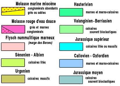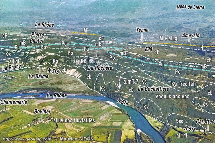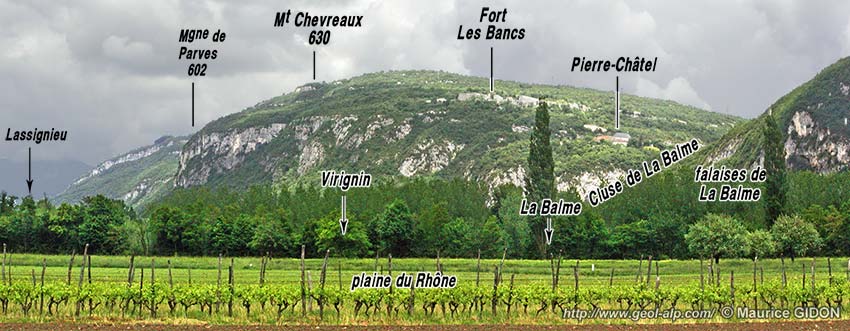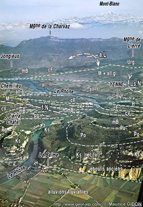![]() Coupe de la rive gauche de la cluse de la Balme (d'après P. GIDON "Géologie Chambérienne, 1963). |