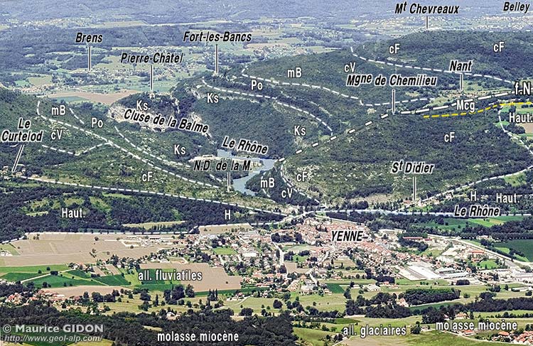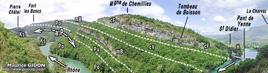 ![]() La Cluse de la Balme, rive droite, vue du sud-est depuis N.D. de la Montagne, près de Yenne. a.P = anticlinal de la Montagne de Parves (= du Mont Tournier). cF : calcaires spathiques bicolores du Valanginien-Berriasien ; cV : calcaires riches en lits marneux (Berriasien supérieur ) ; mB : calcaires massifs, subrécifaux ("marbres bâtards") du Berriasien moyen et inférieur ; Pu : calcaires lités à niveaux marneux du Purbeckien (Berriasien basal et Jurassique terminal) ; Po : calcaires clairs, lités, du Portlandien ; Ks = calcaires massifs, blancs, récifaux, du Kimméridgien supérieur (voir compléments à la page "abréviations"). Le tracé de la faille N-S de Nant est masqué derrière l'épaule de gauche de la Montagne de Chemillieu. |