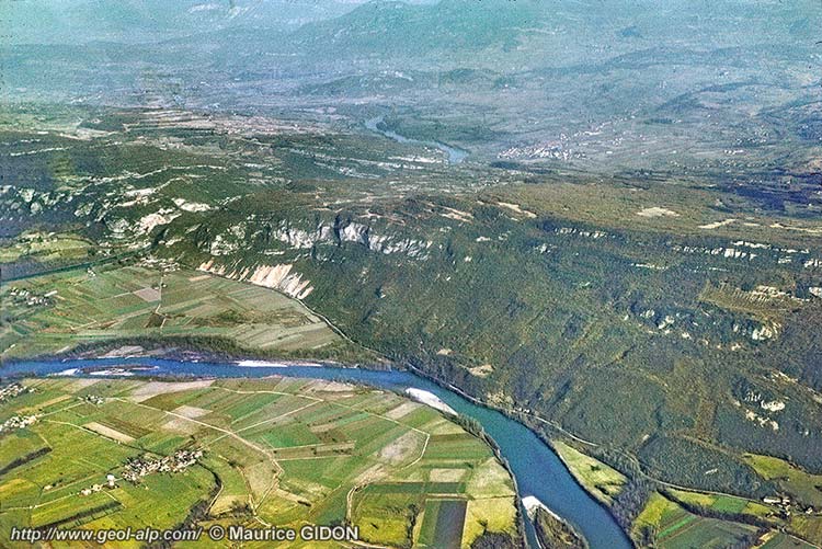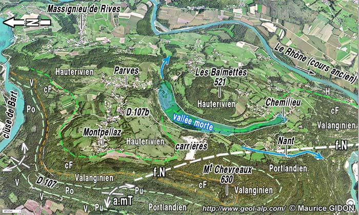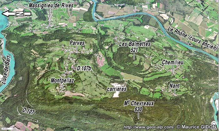 Par contre, à plus de 200 m au dessus du cours actuel du Rhône, entre le village de Parves et celui de Nant, la bosse des Balmettes est isolée du reste de la montagne par un ancien lit fluviatile bien caractérisé par son fond plat, large de 100 à 200 m et sa très faible déclivité du sud vers le nord. On est tenté de penser que cette vallée morte* représente un ancien méandre du Rhône situé en amont de la Cluse de la Balme. Mais sa pente indique que le cours d'eau s'écoulait en sens inverse, s'y engageant à Chemilieu, à partir de la vallée peu en amont de Yenne, pour en sortir vers le nord en retournant vers cette même vallée aux abords sud de Parves (hameau de Martherieu).