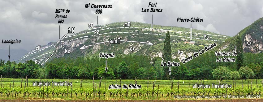 vue de l'ouest, depuis l'aplomb de Peyzieu (ouest de la vallée du Rhône). cFm : calcaires spathiques bicolores du Valanginien-Berriasien ; cV : calcaires riches en lits marneux (Berriasien supérieur ) ; mB : calcaires massifs, subrécifaux ("marbres