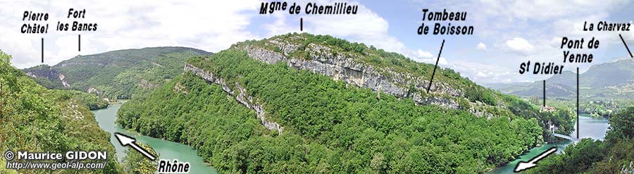 En effet sa structure est très simple puisqu'il s'agit de la moitié orientale d'une voûte anticlinale "coffrée"*, désignée localement sous le nom d'anticlinal de Parves, dont on voit les couches pendre doucement vers l'est jusqu'à s'enfoncer sous la molasse miocène de la dépression de Yenne -Novalaise (les plus récentes de ces couches que recouvre la discordance* du Miocène sont ici celles de l'Hauterivien mais seules celles du Valanginien affleurent le long du lit du Rhône).