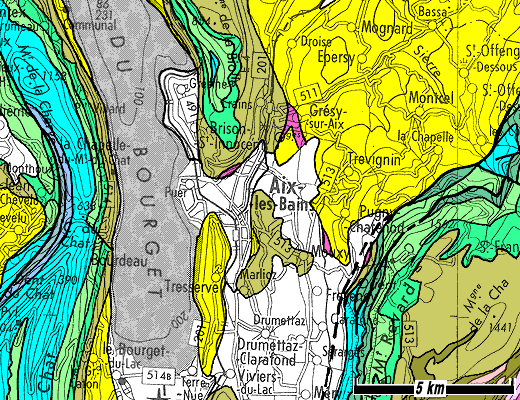 entre les latitudes de La-Motte-Servolex et de Chambéry. Ce dernier ensellement correspond en fait à la traversée de l'axe du grand sillon molassique, oblique aux plis du matériel anté-Miocène, qui court depuis Voreppe en Bas Dauphiné jusqu'à Genève. |