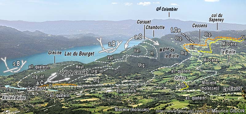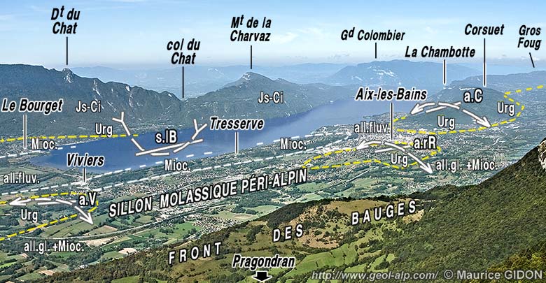 Entre les deux, au nord d'Aix-les-Bains, on voit émerger des molasses du sillon périalpin la voûte urgonienne du chaînon jurassien du Corsuet, qui se prolonge loin vers le nord par celui du Gros Foug.