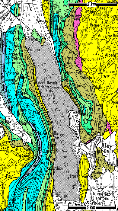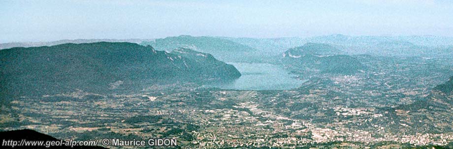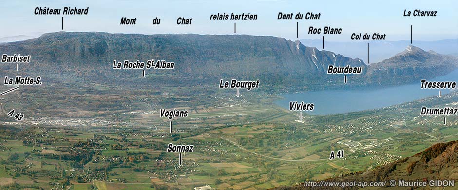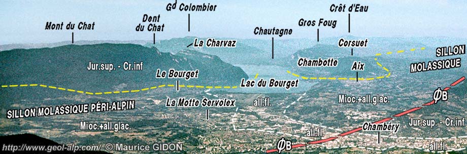 2 - Au sud d'Aix-les-Bains la dépression du lac du Bourget ne se limite plus à ce val mais s'ouvre vers l'est sur la zone de basses collines à substratum molassique de l'Albanais. Des deux chaînons jurassiens qui encadrent le val du Lac du Bourget seul, celui du Mont du Chat, à l'ouest, se poursuit longuement vers le sud (jusqu'au delà de la latitude de Chambéry). Au contraire celui, oriental, du Gros Foug - Corsuet s'efface vers le sud dans les faubourgs nord d'Aix-les-bains.