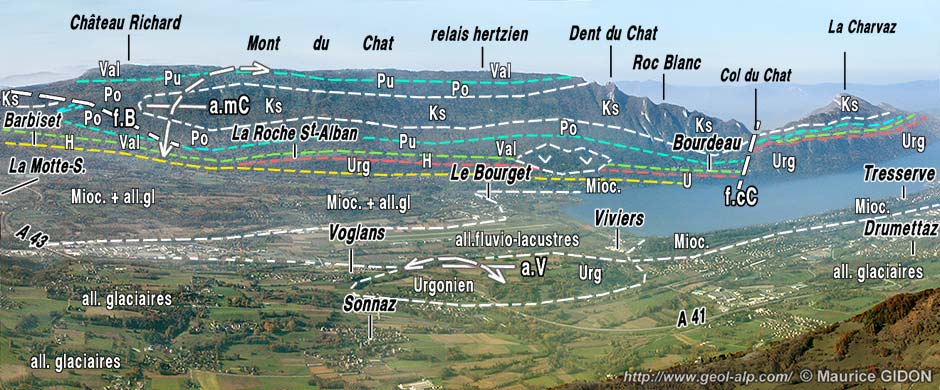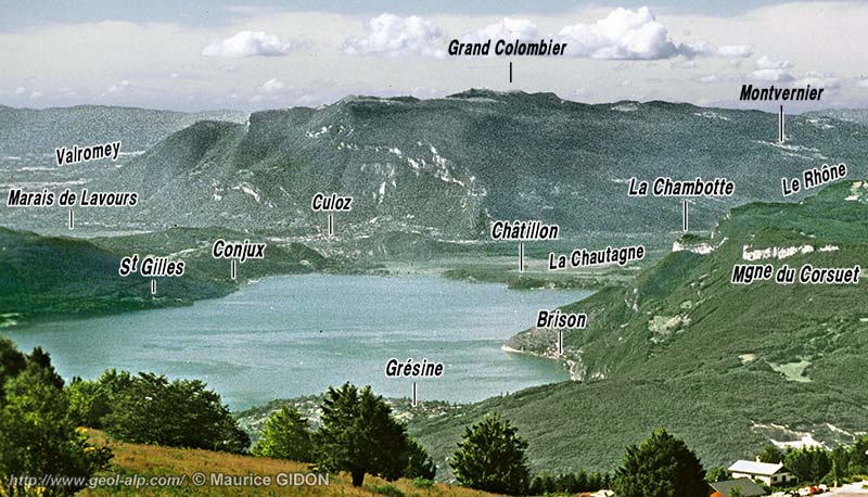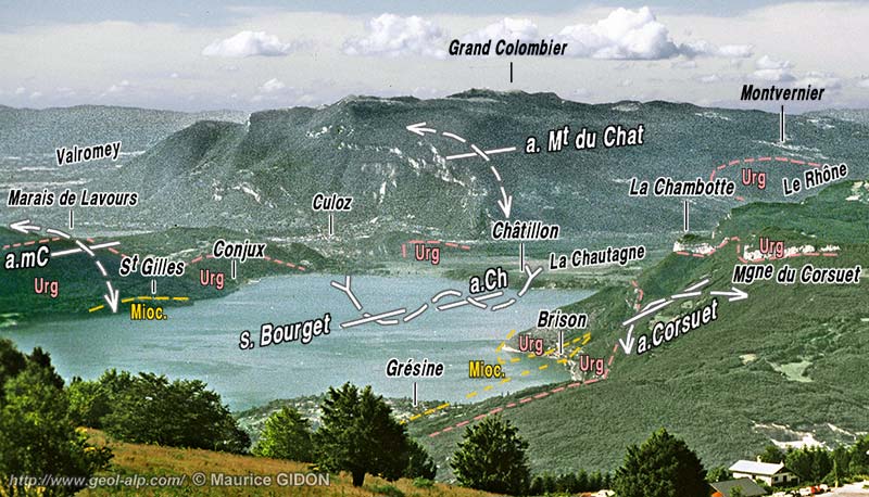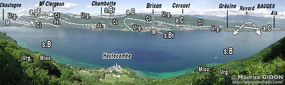 1 - Le chaînon du Gros Foug - Corsuet est l'extrémité méridionale d'un très long mont jurassien* dont la voûte anticlinale urgonienne est presque conservée mais dont la charnière a été crevée plus ou moins profondément par l'érosion (jusque au Jurassique à la latitude de la partie tout-à-fait septentrionale du lac), de sorte que l'échine de la montagne est bordée par un crêt urgonien qui domine le lac du Bourget (voir les pages "Mont Clergeon" et "Chambotte").
