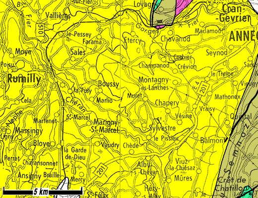 Le soubassement mésozoïque de ces molasses et notamment la carapace constituée par les calcaires urgoniens est atteint par l'érosion dans les Gorges du Fier, sous le village de Lovagny et perce sa couverture molassique plus au nord en formant les montagnes d'Age et de Mandallaz : cela se produit à la faveur d'un soulèvement anticlinal allongé NE-SW dont la voûte culmine à la montagne de Mandallaz (au delà elle s'enfonce pour disparaître de nouveau au nord des gorges du Pont de la Caille).