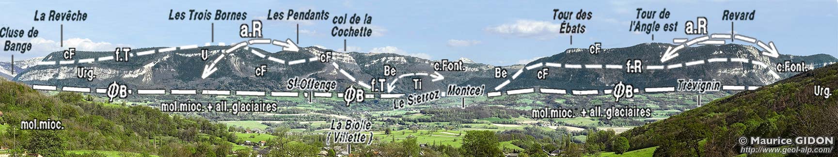 Le tracé du chevauchement frontal les Bauges est masqué, mais aisément localisable, au nord du Mont Revard, entre la vallée du Sierroz et celle du Chéran ; il réapparaît plus au nord dans la Cluse de Bange, au Pont de l'Abîme puis il est de nouveau masqué, au nord de cette entaille, sous les dépôts quaternaires des basses pentes occidentales du Semnoz (où il ne se poursuit d'ailleurs pas avec certitude).