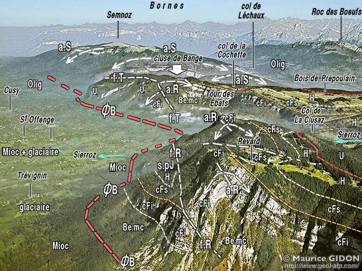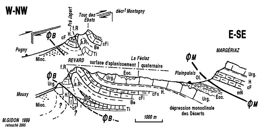 ![]() Coupes transversales au chaînon du Revard (comparer avec la coupe de la cluse de Bange) ØB = chevauchement frontal des Bauges ; ØA = chevauchement de La Parsalle, passant à la faille occidentale du Revard ; a.R = anticlinal du Revard ; fl.Ébats = flexure synclinale des Ébats ; fl.Lachat = flexure anticlinale du Mont Lachat ; ØM = chevauchement du Margériaz Noter que l'obliquité de la surface ØM par rapport à la succession de la tranche de couches chevauchante, qu'elle sectionne en biseau. |
