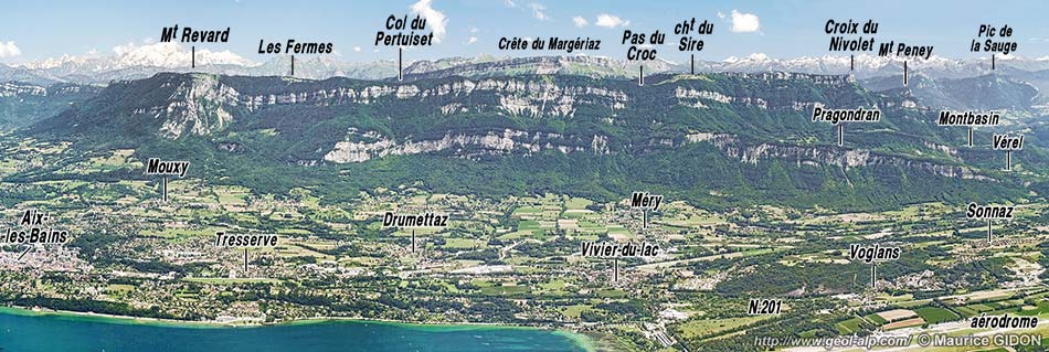 Au sud de la vallée du Chéran le massif des Bauges est très nettement délimité par un front d'escarpements qui constituent la retombée d'un chaînon, peu acéré par ailleurs, qui court depuis la Montagne de Bange jusqu'au Nivolet en faisant un coude pointant vers le nord-ouest au mont Revard. Sa crête (qui n'est souvent qu'un rebord de plateau) domine du côté ouest la vaste dépression synclinale composite de Rumilly et du Lac du Bourget, à laquelle se réduit, à cette latitude, le sillon molassique périalpin*.