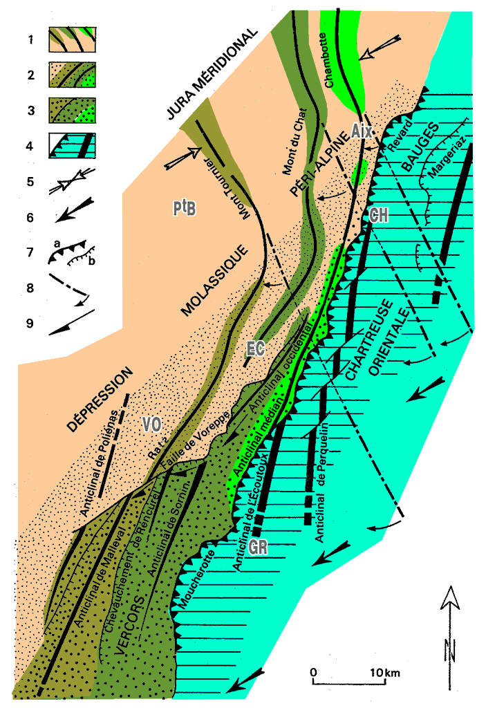 ØB = chevauchement "frontal" des Bauges ; ØP = chevauchement de La Parsalle ; ØV = chevauchement de Vérel.