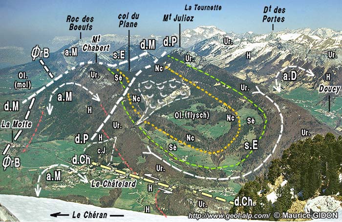 Toutefois, 2 km au nord du Châtelard, la barre urgonienne du flanc ouest du pli s'érige beaucoup plus en saillie pour former la crête du Mont Chabert. Ce changement dans le relief est lié au passage du tracé décrochement dextre NE-SW du col du Plane : c'est sans doute un certain rétrécissement du faisceau de plis (et notamment de l'anticlinal de La Motte) au NW de cette cassure qui est cause de cet accroissement du pendage du flanc ouest du synclinal.