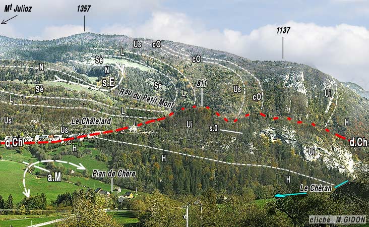 À l'est du Châtelard, au sud des Garins, la charnière synclinale est suivie par le lit du ruisseau du Petit Mont, dont le lit s'inscrit en descendant dans la succession des couches (voir le cliché suivant) : il atteint le couches sommitales de l'Urgonien au lieu-dit Le Grand Pré, au sud duquel les niveaux inférieurs de la succession ne sont pas visibles, : ils y sont sans doute masqués sous le colmatage alluvial qui y détermine une terrasse suspendue au dessus du cours actuel du Chéran. Plus au sud sous cette terrasse, au pont d'Escorchevel (1,5 km au SE du Châtelard), les couches tout-à-fait basales de l'Urgonien du flanc oriental du pli (pentées vers le N-NW) affleurent jusqu'au niveau du lit du Chéran avec un pendage presque vers le nord : cela indique que la charnière du pli doit passer bien peu à l'ouest et doit y buter, à l'entrée amont de la gorge du Chéran, contre l'Urgonien du flanc ouest du pli par l'intermédiaire du décrochement du Châtelard. |