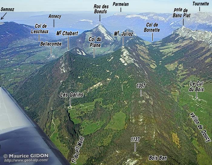 La portion de chaînon montagneux qui domine le Châtelard du côté NE culmine au Mont Julioz. Il prolonge vers le sud, au delà de la vallée transversale de Bellecombe et des villages de Mont, le chaînon d'Entrevernes. Comme ce dernier il est en fait constitué par deux crêtes parallèles,l'une et l'autre formées par la barre urgonienne, dont la plus occidentale est celle du Mont Chabert. Cet ensemble représente un val (un synclinal perché*, par conséquent), ouvert (sans être très profondément affouillé d''ailleurs) dans le cœur nummulitique du synclinal d'Entrevernes.