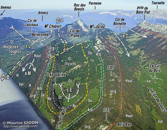 Cette géométrie implique en tous cas que l'axe du synclinal d'Entrevernes s'abaisse vers le sud, plutôt qu'il ne s'élève, à la latitude de sa traversée par la vallée du Chéran ; en fait l'altitude atteinte par cet axe au niveau du sommet de l'Urgonien y est supérieure d'à peine 150 m à celle du lit de cette rivière et la base de l'Urgonien sous le thalweg avoir une altitude de l'ordre de 500 m seulement.