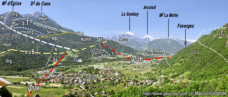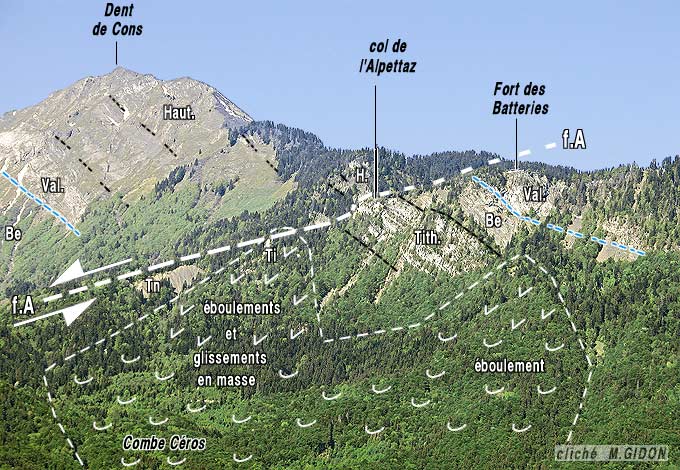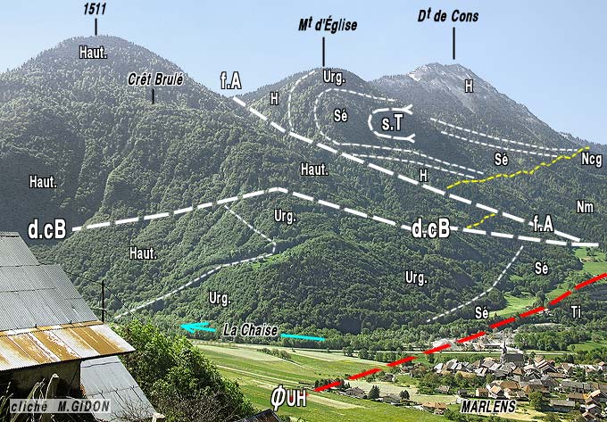 En fait leurs affleurements sont séparés de ceux de l'autochtone de la Dent de Cons par une cassure NE-SW, le décrochement du Crêt Brulé. Cette faille représente assez vraisemblablement le prolongement du décrochement de Bouchasse du secteur de la Sambuy, qui décale, entre les deux, le synclinal de Tamié au sud de Frontenex (voir les pages "Seythenex" et "Faverges"). Le tracé de cette faille lui fait rejoindre et probablement sectionner celui de la faille de l'Alpettaz dans le versant ouest de la montagne, au dessus du village de Cons.