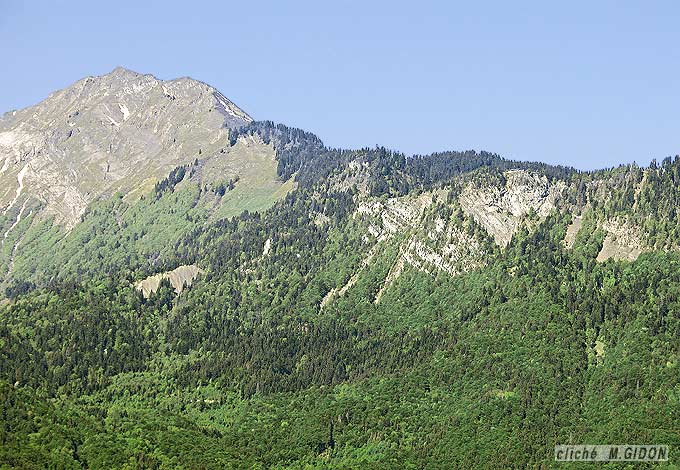 L'absence de couches urgoniennes qui assureraient le couronnement de ce crêt est remarquable : elle s'avère être sans doute due en grande partie au fait qu'elles ont été érodées avant le dépôt du Nummulitique ; c'est ce que montre l'étude les pentes boisées du versant nord-occidental de la montagne, où affleurent les couches urgoniennes inférieures, respectées là par cette érosion (voir le cliché plus bas dans cette page). |