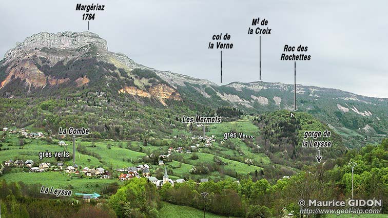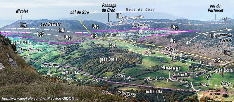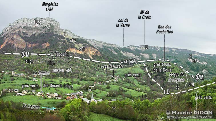 ![]() La vallée de la Leysse au niveau des Déserts, vue de l'ouest, depuis la D.206, sous le village des Fabre. ØM = surface de chevauchement du Margériaz ; f.D = faille de la Doria N.B. : le revers sud du Roc des Rochettes est analysé à la page "Peney". |