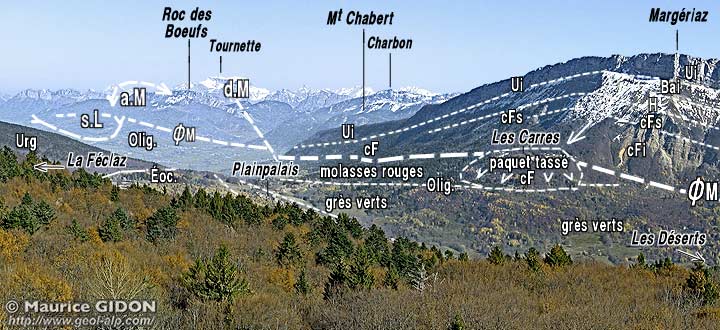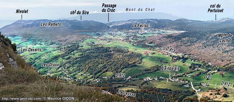 ![]() La fermeture méridionale de la dépression des Déserts, vue du SE, depuis le sommet de la Galoppaz. La dépression des Déserts comme celle de Thoiry qui s'ouvre plus au sud, à l'est du Peney, sont drainées par la Leysse. Sous le village des Déserts ce torrent traverse d'abord, orthogonalement, la faille de la Doria (d.D), qui est un décrochement orienté NE-SW ; plus en aval il suit approximativement le tracé qui tranche la succession du Peney du côté est et qui est interprété comme celui du chevauchement du Margériaz (ØM). Les affleurements nummulitiques de la dépression des Déserts s'engagent du côté est sous les calcaires du Fontanil de la base de la succession chevauchante du Margériaz. Plus au sud (en avant sur le cliché) cette succession se complète par des termes de plus en plus bas dans la série stratigraphique (marnes de Narbonne) et la surface de chevauchement est décalée "en baïonnette" par la faille de La Fougère (f.F) qui lui est transverse (elle ne se prolonge toutefois pas à l'ouest de la Leysse). a.R = anticlinal de la Roche de Barby (cf. page "Curienne"). |