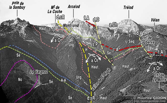 Le fort plongement vers le nord que manifeste ici l'axe de ce synclinal de Serraval est dû à ce qu'il s'est inscrit dans des couches qui pendaient déjà vers l'est, antérieurement à cette nouvelle torsion, car elles appartenaient au flanc oriental de l'anticlinal d'Orisan. L'axe de ce dernier pli, orienté à 45° par rapport à celui du synclinal de Serraval est également tordu par ce dernier : il plonge vers le nord entre la Pointe de Chaurionde et l'Aup de Seythenex puis commence à remonter vers le nord dès le Montriond et poursuit ainsi en traversant le vallon de Saint-Ruph. |