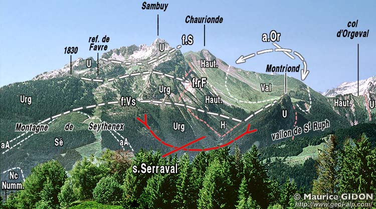 L'axe du grand pli majeur (mais tardif) que constitue ce synclinal de Serraval est orienté NE-SW. Il passe ici à l'Aup de Seythenex, puis entre la Petite Sambuy et le Montriond, et enfin à peu près au pied des pistes de la station de ski de Seythenex (Le Vargnoz), avant de se poursuivre vers Seythenex et au-delà).