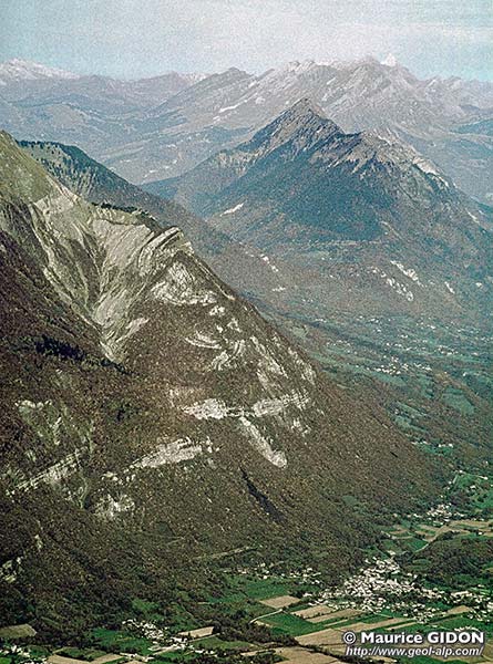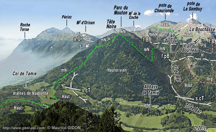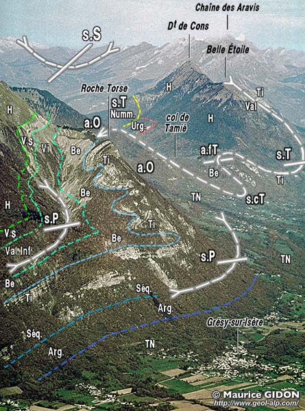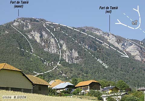 Les pentes méridionales du Fort de Tamié, vues du sud, depuis le village de Verrens s.cT = synclinal du col de Tamié ; a.fT = anticlinal du Fort de Tamié. Noter la disposition en plis presque couchés et la forme dissymétrique, avec un flanc court du côté ouest, indiquant que c'est de ce côté que l'on doit rencontrer un anticlinal majeur (il s'agit de celui d'Orisan - Chaurionde), tandis que le synclinal majeur se situe du côté est : de fait ce sont là les deux replis du flanc ouest du synclinorium de Tamié qui sont les plus proches de la charnière principale de ce pli, indiqué, pour mémoire, à sa position approximative (s.T) car il passe dans les affleurements à droite du champ du cliché. |