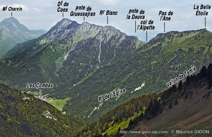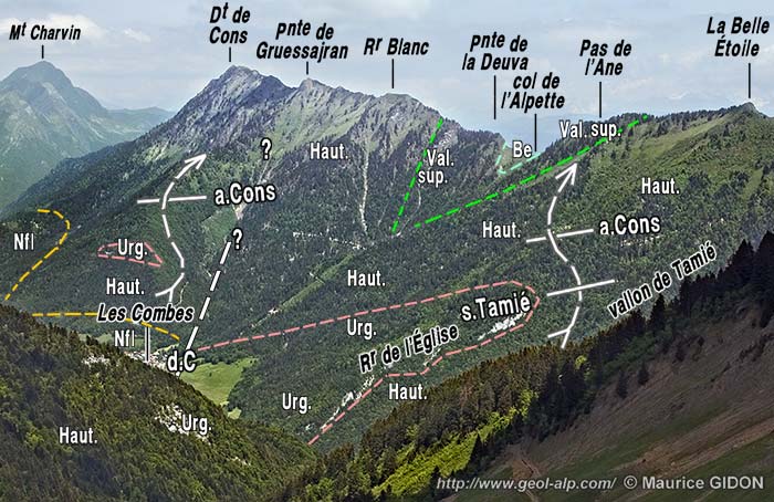 Il est à remarquer que, dans le versant ouest de la Dent de Cons, au nord du village des Combes, le Nummulitique repose directement sur l'Urgonien, voire même sur l'Hauterivien. Cette disposition témoigne de l'arasement anté-Nummulitique d'un ancien relief, qui correspond très vraisemblablement à la voûte de l'anticlinal qui succédait, du côté est, au synclinal de Tamié : cela signifie que ce pli était ébauché avant le Nummulitique, conclusion qui ne fait que rejoindre celle tirée de l'étude des autres plis anticlinaux dont la voûte anté-Nummulitique est conservée (ce qui est d'ailleurs exceptionnel), notamment ceux de la Chartreuse occidentale et du Jura méridional. |