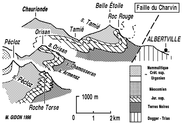 ![]() Coupe des Bauges orientales, montrant les multiples replis du fond du synclinorium au niveau du Jurassique supérieur. Concernant l'hypothèse, représentée ici, de la poursuite, à cette latitude, du système de failles du Charvin (et principalement de celle de la Goenne) voir la page "Ugine". |