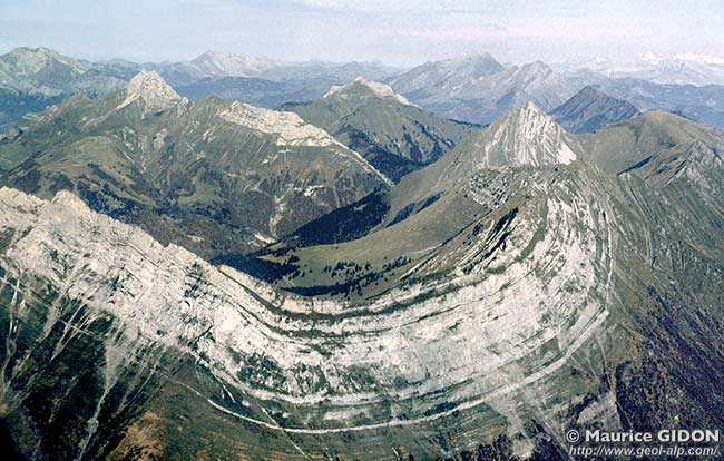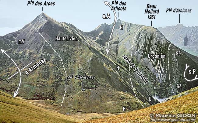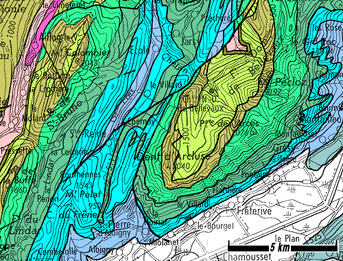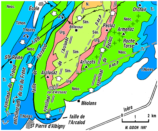 pli couché d'axe N10 qui affecte le haut du flanc oriental du pli précédent. Le tracé de la faille de l'Arcalod s'infléchit en sens anti-horaire à l'est de Saint-Pierre d'Albigny et doit se poursuivre au-delà vers le NE, sous les alluvions. Sa surface décrit donc, là où elle est traversée par l'axe du synclinal de l'Arclusaz, une courbure synforme coaxiale avec ce pli. |