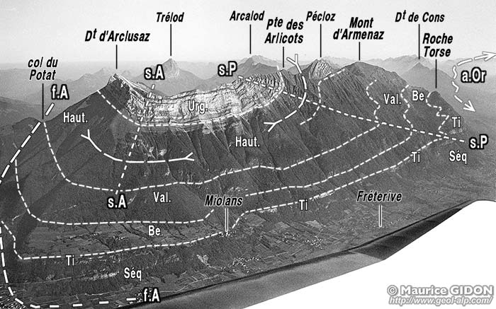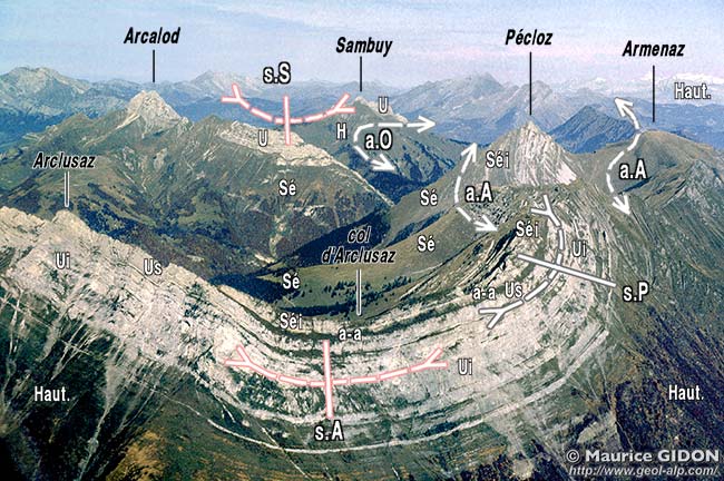 ![]() La cuvette synclinale de la montagne de l'Arclusaz, vue d'avion, du sud. Cette vue, prise dans l'axe du synclinal du Pécloz montre son inclinaison vers le nord (vers l'arrière-plan) : le Sénonien affleure en effet dans les bois du fond de vallée, à Bellevaux. On voit aussi que ce val évide en fait un pli que l'on peut dire composite, car il comporte deux charnières synclinales dont les plans axiaux se recoupent : - le synclinal du Pécloz (s.P), dont le plan axial pend à 30° vers l'est (c'est un pli couché déversé vers l'ouest) et est affecté par le repli anticlinal de l'Armenaz. - le synclinal d'Arclusaz proprement dit (s.A), dont le plan axial presque vertical (en fait un peu déversé vers l'est) passe exactement au col de l'Arclusaz et plonge vers la gauche (vers le nord). Il est distinct par sa direction axiale du très long synclinal N40 de Serraval (s.S), qui recoupe transversalement l'anticlinal d'Orisan (a.O) , qui fait suite à ces plis, plus à l'est. voir plus en détail les crêtes d'arrière-plan à la page "Mont de la Coche" |
