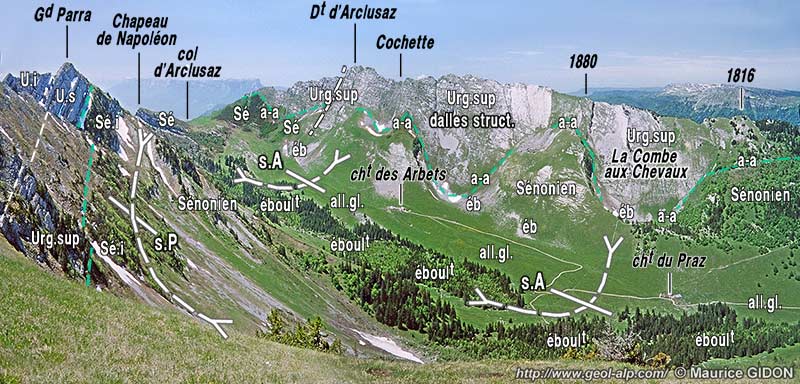 Le large fond du vallon d'Arclusaz est d'ailleurs presque totalement couvert de matériel morainique local qui a dû être alimenté par le débordement des langues de glace issues de ces cirques ; il s'y surajoute toutefois de puissants amas de blocs, maintenant couverts de bois, qui correspondent à d'anciens éboulements. Leur répartition est clairement celle de coulées provenant de la rive opposée (crête du Grand Parra), d'où les couches, verticales et même renversées, ont dû se détacher par basculement.