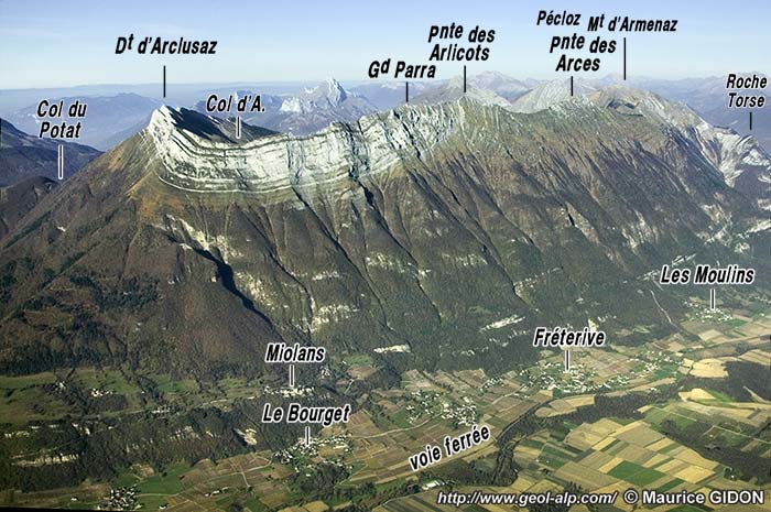 - La seconde est révélée par une vue d'altitude permettant de jeter un regard plongeant sur le versant NW du Col d'Arclusaz. Elle montre que ce berceau synclinal est évidé par l'érosion en un val jurassien* très bien caractérisé, que draine le torrent du Chéran au niveau de sa gorge de Bellevaux.