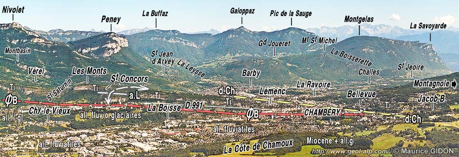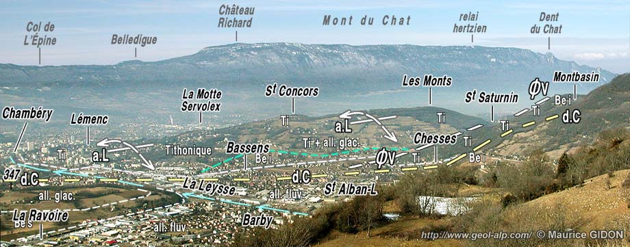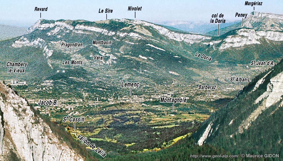 ![]() Chambéry, au débouché nord-ouest de la trouée des Marches , vu du sud, depuis le sommet nord du Granier ØB = chevauchement frontal des Bauges (= chevauchement de la Chartreuse occidentale) ; ØV = chevauchement de Vérel ; d.Ch = décrochement de Chambéry ; d.D = décrochement de la Doria; d.pF = décrochement du Pas de la Fosse ; s.ChO = synclinal chartreux oriental ; a.Bo = anticlinal de la Boisserette, de la Roche de Barby et du Peney ; les deux charnières dessinées plus à gauche sont successivement celle de l'anticlinal de Barberaz puis celle de l'anticlinal de Montagnole. Ce cliché montre comment la cluse de la ville de Chambéry tranche l'extrémité du chaînon du Revard et raccorde la dépression du sillon molassique périalpin avec la trouée des Marches, qui s'ouvre vers le sud à partir de La Ravoire. Toutes les pentes boisées de premier plan sont des dalles structurales de Berriasien moyen à supérieur qui pendent vers la droite pour s'enfoncer sous les alluvions quaternaires de la Trouée des Marches (voir la page "Montagnole"). Elles représentent le flanc ouest du grand synclinal chartreux oriental. |