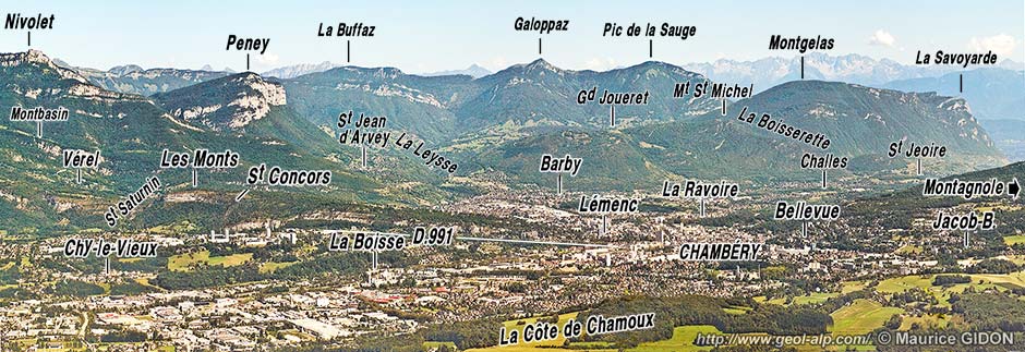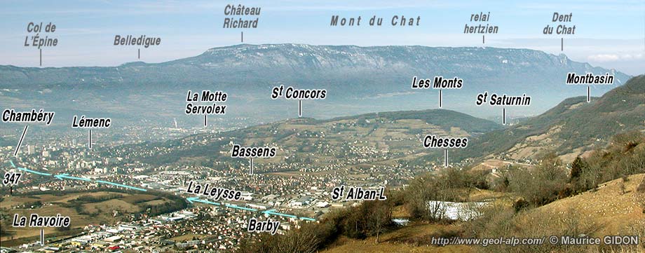Au nord immédiat de Chambéry la voûte de cet anticlinal de Lémenc, large et très ouverte*, se développe jusqu'à la Croix de Saint-Concors (509 m), point au nord duquel elle subit une inversion du relief car elle est crevée par l'érosion en un petit hémicycle ouvert en direction de La Croix Rouge. A cette latitude la retombée occidentale de cette charnière se montre tranchée, au pied des escarpements, par le chevauchement frontal des Bauges.