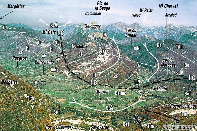 ![]() Détail de la structure de la dépression de La Thuile, vue du sud, d'avion, depuis l'aplomb de Montmélian. Cette photo est prise presque dans l'axe du synclinal des Aillons (s.A), qui plonge vers l'arrière-plan. De ce fait elle en donne une bonne coupe, qui montre que le flanc oriental de ce pli est affecté par une charnière synclinale couchée que l'on peut appeler "synclinal de Marocaz" (s.M). On a indiqué le tracé de la faille du Céty (F.C.) : la torsion de cet accident, dans les niveaux inférieurs à l'Urgonien, apparaît clairement sous cet angle ; la cassure se poursuit vers le sud-est par la faille du ravin de la Crousaz, qui détermine le ravin descendant du col de Marocaz, au delà de la marge droite du cliché (F.C.). (vue complémentaire vers la droite à la page Saint-Pierre d'Albigny) Se reporter égalementà la carte géologique ci-dessus |