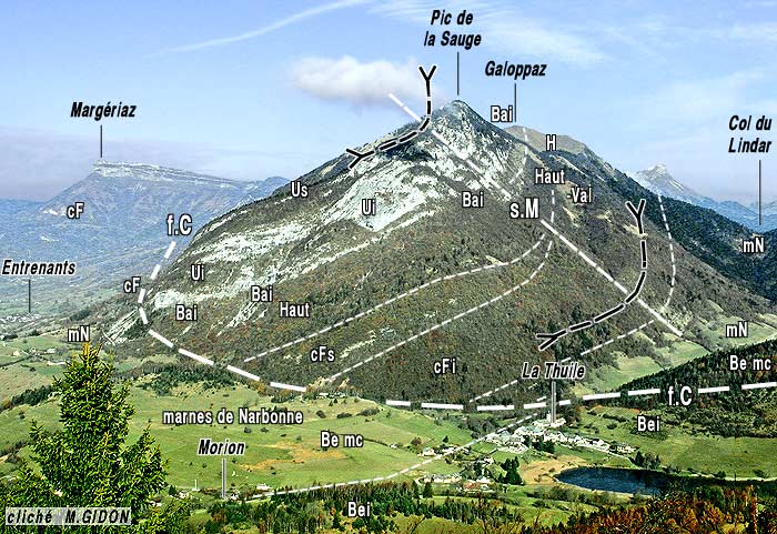Cette disposition est due à ce que l'axe du synclinal des Aillons se relève vers le sud, de sorte que les différents niveaux stratigraphiques qu'il affecte sont à tour de rôle sectionnés au niveau de sa charnière entre le Pic de la Sauge et les pentes sud-orientales de la Roche du Guet (qui correspond, quant à elle, à l'extrémité méridionale des affleurements de Tithonique du synclinal, au bord de l'entaille de la combe de Savoie).