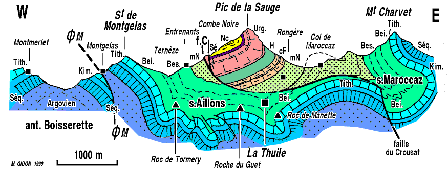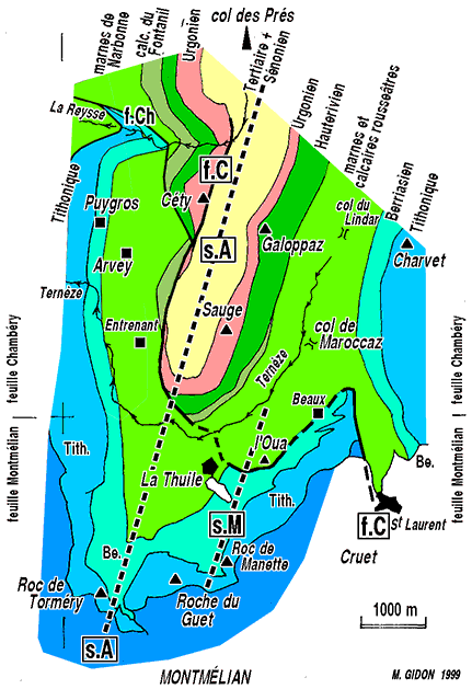 Carte géologique simplifiée des environs de La Thuile Cette carte, inédite, est basée sur les observations de l'auteur de ce site. Elle ne cherche pas à rendre compte de tous les aspects ordinairement abordés sur une carte géologique et ne figure notamment pas le quaternaire de façon exhaustive. f.Ch = faille des Chavonettes ; s.A = synclinal des Aillons ; f.C = faille du Céty et faille du Crouzat ; s.M = synclinal de Marocaz - Roc de Manette. noter la disparition latérale, d'ouest en est, de la barre des calcaires du Fontanil. |
