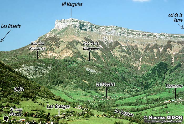 La montagne du Margériaz (1845 m) a le profil caractéristique d'un rebord de plateau, car c'est un crêt* très peu incliné vers l'est. Son pied occidental est traversé, en bas du raide talus qui soutient sa falaise, par une importante surface tectonique, le chevauchement du Margériaz. Le tracé de cet accident se repère aisément car il fait reposer les calcaires du Fontanil (qui donnent des falaises rousses) sur l'Oligocène de la dépression des Déserts (qui détermine des pentes beaucoup plus molles), même s'il est souvent masqué par une jupe d'éboulis, voire par des paquets tassés plus ou moins disloqués.