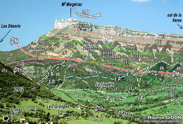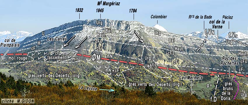 Au sud de cette faille apparaissent diverses complications qui sont figurées sur le cliché ci-après . L'analyse des rapports entre ces divers accidents et avec le chevauchement du Margériaz est développée à la page Peney. La conclusion la plus importante est que la surface de chevauchement du Margériaz se trouve reportée là presque jusqu'au lit de la Leysse, soit de presque 2 km vers l'ouest, par le jeu d'une déchirure transverse aboutissant au village de Thorméroz.