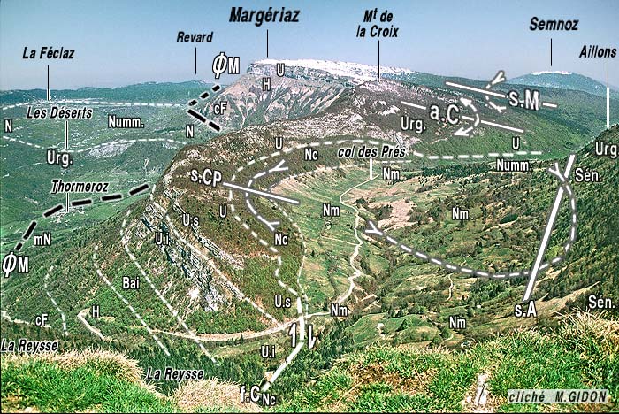 ![]() La partie méridionale du chaînon du Margériaz vue du sud depuis le sommet de la Galoppaz. - A/ Sous cet angle, qui montre d'enfilade la longue corniche sinueuse du Margériaz, on voit que sa dalle urgonienne, très peu inclinée vers le sommet, s'infléchit pour plonger un peu plus fortement sous la vallée des Aillons. Le raccourci perspectif met bien en évidence les amples ondulations NE-SW, qui affectent cette dalle urgonienne et leur disposition transverse par rapport au synclinal des Aillons (s.A) : ce sont le trans-synclinal du col des Prés (s.CP), le trans-anticlinal du Mont de la Croix (a.C) et le trans-synclinal du Margériaz (sM). Ce dernier pli représente apparemment le prolongement oriental du synclinal de la Doria, qui traverse transversalement la dépression des Déserts. L'anticlinal du Mont de la Croix, quant à lui, semble moulé sur l'éperon d'Urgonien qui forme le flanc sud du synclinal de la Doria (Roc de la Chavonne) et qui est tranché par le décrochement de la Doria (d.D). - B/ Noter qu'au débouché amont des gorges de la Reysse, la limite Nummulitique - Urgonien et celle (tiret fins) entre les calcaires nummulitiques (Nc) et les marnes à Meletta (Nm) viennent se raccorder au tracé de la faille du Céty (f.C) : ce dessin des contours entre les formations traduit le fait que cette faille est cachetée par les dépôts du Nummulitique. À l'ouest de la ligne sinueuse du crêt du Margériaz le regard plonge sur la dépression monoclinale des Déserts et de Thoiry : ØM = chevauchement du Margériaz . |