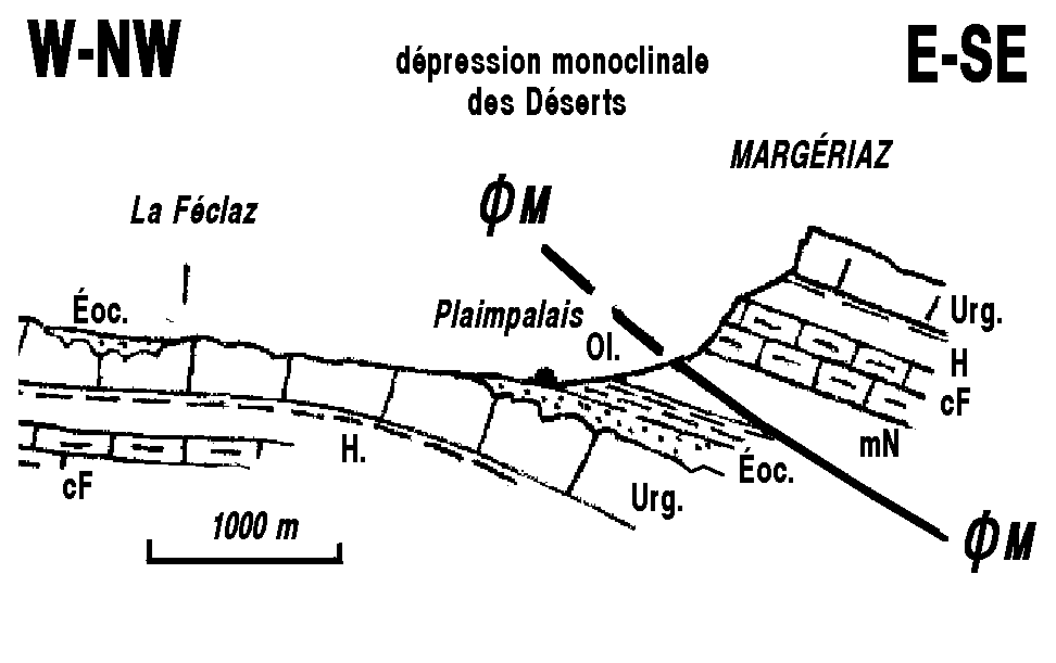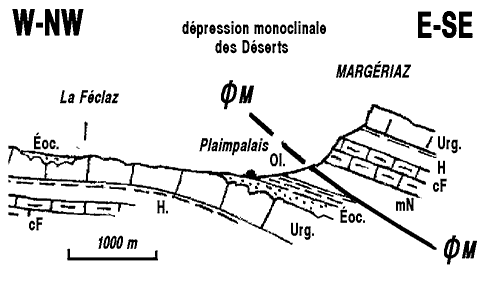 Le secteur correspondant à cette disparition est une zone du fond de la vallée du Chéran où le bedrock rocheux est largement masqué par les alluvions quaternaires. Le fait que cet accident ne réapparaisse pas au nord de cette rivière, dans le coeur du synclinal de Leschaux (où l'orientation de son tracé devrait pourtant le conduire) est étonnant car il ne montre pas, au préalable, d'indice d'atténuation : cette interruption a donc nécessairement une origine tectonique, mais celle-ci reste conjecturale (cette question est examinée à la page "Aillon-Noyer"). Dans ce contexte on doit cependant se rappeler que la dalle du Margériaz se situe sensiblement à la limite occidentale atteinte par la mer priabonienne, au delà de laquelle le substatum crétacé est resté émergé, a été érodé et n'a reçu que des dépôts continentaux : on peut donc se demander si son "détachement" initial (voir la page "Aillon-Noyer") ne correspond pas à une faille éocène extensive, à rejet symétrique de la faille du Céty (voir la page "Galoppaz") , à l'ouest de laquelle serait affaissé le petit bassin continental des Déserts. |