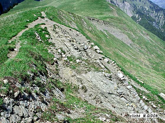 Sur la crête d'Orisan, à la selle qui sépare le Mont d'Orisan du Grand Roc, la présence de la charnière de l'anticlinal d'Orisan est clairement mise en évidence par la microtectonique qui lui est associée. En effet à cet endroit les couches marno-calcaires de l'Argovien permettent une observation aisée des rapports schistosité / couches : ceux-ci s'inversent d'un flanc à l'autre d'une façon significative et exemplaire (se reporter au schéma général).
