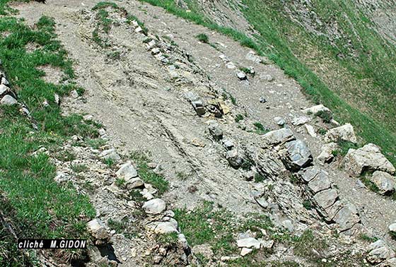 Le ravin de La Lanche ne montre enfin que le flanc inverse de l'anticlinal, bien dessiné par le Tithonique. Mais on en voit les couches crétacées, renversées, qu'affouille le ravin. On y distingue au sein de couches berriasiennes un repli, en forme de S inversé, dont le plan axial traverse les couches. Sa disposition est tout-à-fait celle qui correspond aux plis parasites formés au flanc du pli principal par le glissement relatif des couches (voir la page "plis").