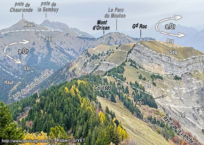 Cette disposition topographique a pour inconvénient que le dessin en coupe de ces plis n'y est guère lisible. On ne peut s'en faire une idée juste qu'à la faveur des deux entailles naturelles qui sont transversales à ce chaînon, savoir celle du col du Haut du Four au nord et celle du profond ravin de La Lanche au sud-est. Ces deux coupes, complémentaires l'une de l'autre, révèlent l'importance relative qu'y prend l'anticlinal d'Orisan.