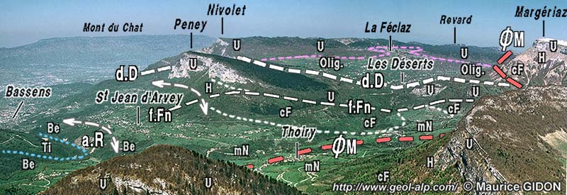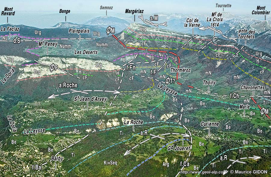 ![]() Le versant sud-occidental du Margériaz, vu du S-SW depuis la D11, peu au nord de Curienne. s.M = synclinal du Margériaz (sur le revers de la crête) ; ØM = chevauchement du Margériaz. Noter qu'il n'y a là aucun flanc inverse de pli-faille mais une faille compressive très peu oblique aux couches (sa surface de chevauchement correspond sensiblement, au nord de La Fougère, à la base des calcaires du Fontanil) ; ØTh = chevauchement de La Leysse au NW de Thorméroz (son tracé est masqué sous cet angle de vue). f.R = faille des Rochettes ; f.P = faille de La Palud ; f.F = faille de La Fougère. Ol.gv = Grès verts oligocènes des Déserts ; Ol.gb = Grès bruns éocènes de la Doria (voir l'aperçu stratigraphique). |