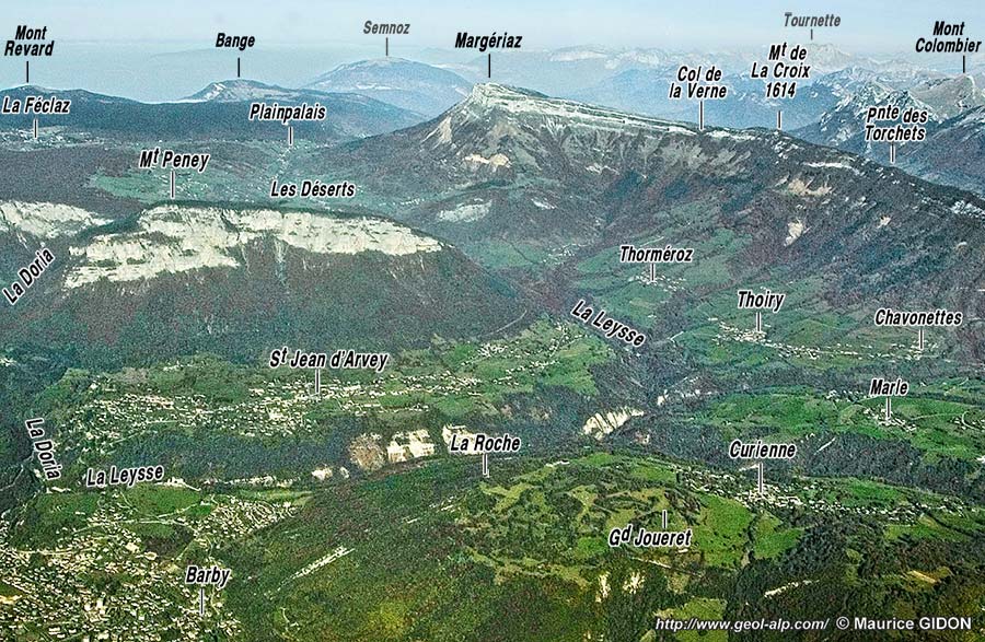 Ce garnissage alluvial y cache sans doute des détails structuraux, notamment le prolongement de la faille de Camelot au nord de Curienne et le chevauchement de Thormeroz (?) qui limite du côté oriental les calcaires du Fontanil du revers oriental du Peney : en effet, à la latitude des villages de Thorméroz et La Fougère ils font place aux marnes de Narbonne, qui affleurent sous les alluvions de rive orientale de la Leysse, alors qu'ils descendent plus bas, jusqu'au lit de ce torrent sur sa rive occidentale. |