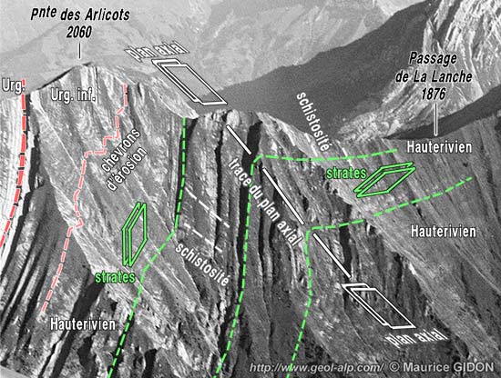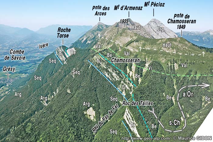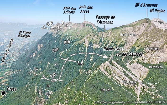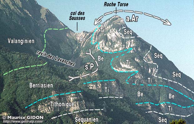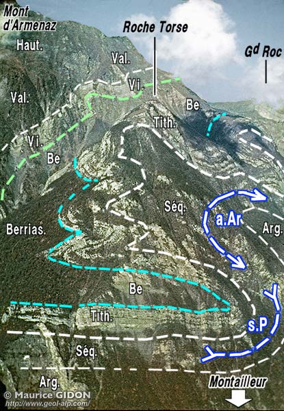 La Roche Torse Vue selon la perspective la plus favorable, c'est-à-dire à peu près dans l'axe des plis (en azimut comme en plongement). Les plis de la Roche Torse appartiennent en fait à un anticlinorium "en feuille de chêne" fortement déversé vers l'ouest. Il s'agit de l'anticlinal d'Armenaz (a.Ar) qui n'est lui même qu'un pli parasite qui s'intercale entre les charnières plus importantes de l'anticlinal d'Orisan (à l'est) et du synclinal du Pécloz (= s.P) à l'ouest. Noter que la limite entre le Berriasien et l'ensemble Hauterivien-Valanginien