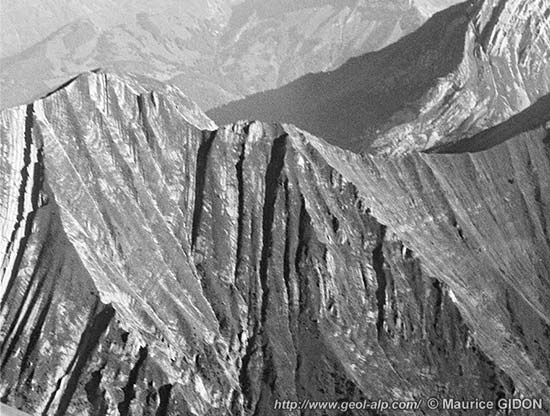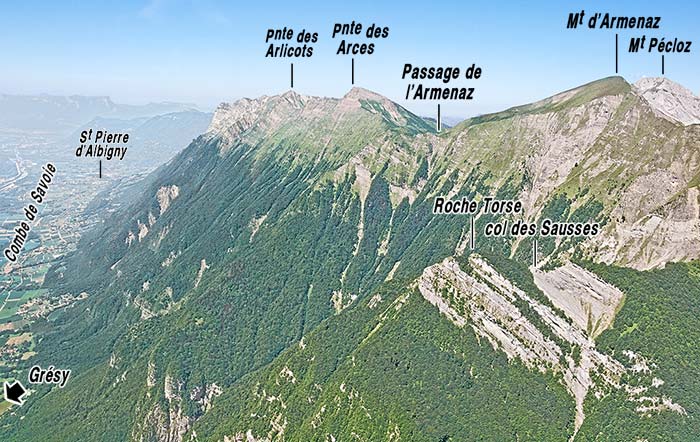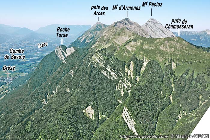 Le versant des Bauges qui, au nord-est de Saint-Pierre-d'Albigny, tombe abruptement sur la Combe de Savoie, offre une coupe naturelle déjà spectaculaire, malgré la perspective en contre-plongée, lorsqu'on la voit de la vallée (voir page "Saint-Pierre-d'Albigny") ; elle l'est encore plus lorsque l'on prend de l'altitude (depuis les crêtes du massif des Sept Laux ou, encore mieux, depuis un avion de tourisme).