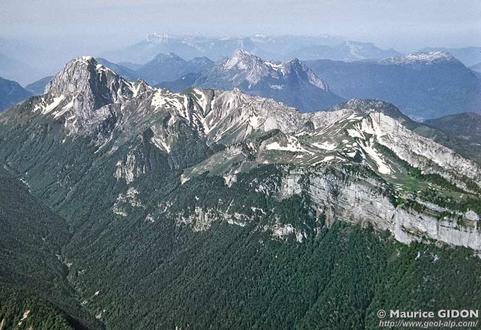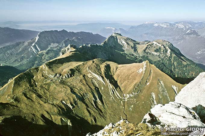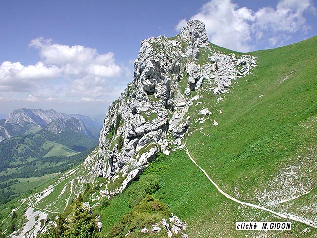 Plus au sud, jusqu'au col de Charbonnet, les abrupts urgoniens se situent nettement en contrebas de la crête, qui est formée là par la corniche des calcaires nummulitiques ; au nord c'est au contraire l'Urgonien, fortement redressé, qui constitue la crête, jusqu'au delà de la pointe de Banc Plat.